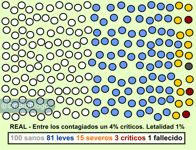 Bien, para intentar explicarlo de modo simple, imaginemos un grupo de 200 personas:En ese grupo 100 personas tienen #COVID-19. De ellos 81 son casos leves, 15 severos y 4 críticos (1 fallecido). Algo como en este esquema: